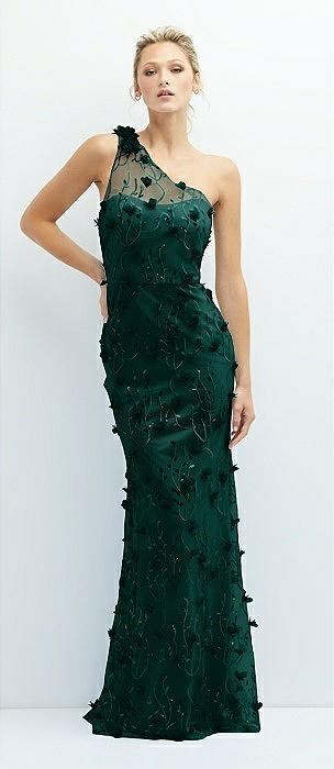 One-Shoulder Fit and Flare 3D Floral Embroidered Dress in evergreen
