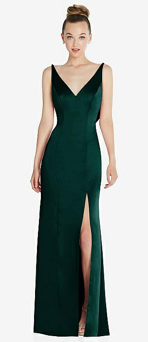 Bow-Shoulder V-Back Chiffon Gown with Front Slit in evergreen
