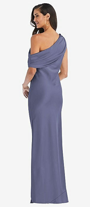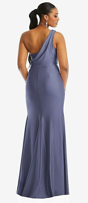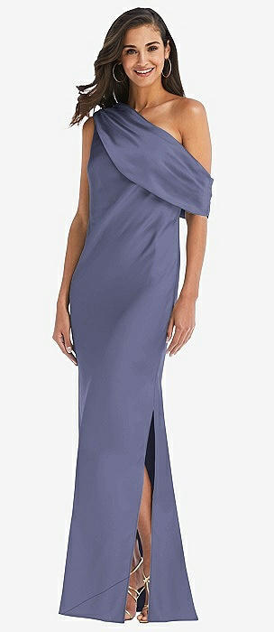 One-Shoulder Asymmetrical Cowl Back Stretch Satin Mermaid Dress in french blue