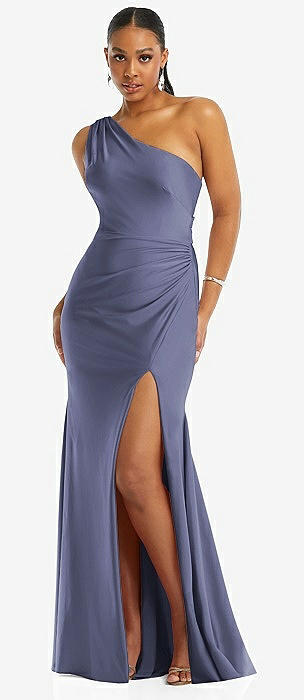 Shirred One-Shoulder Satin Trumpet Dress - Maddie in french blue