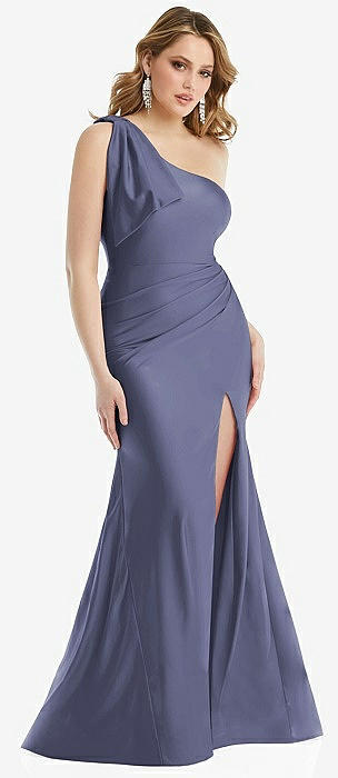 Cascading Bow One-Shoulder Stretch Satin Mermaid Dress with Slight Train in french blue