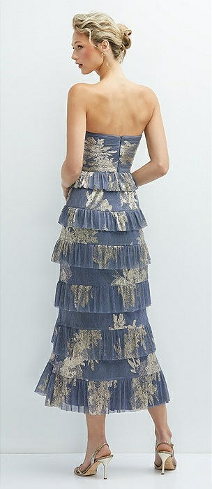 Ruffle Tiered Skirt Metallic Pleated Strapless Midi Dress with Floral Gold Foil Print