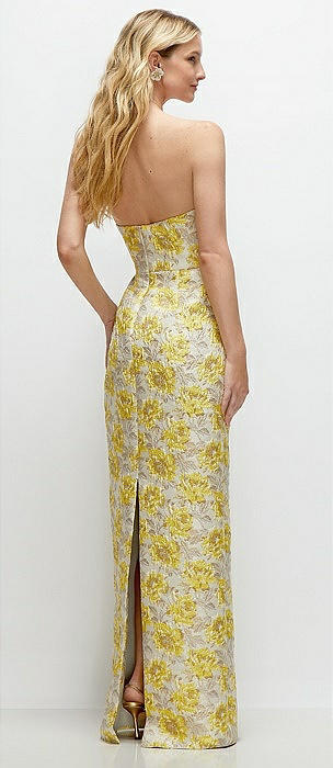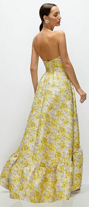 Golden Yellow Strapless Cat-Eye Floral Jacquard Corset Mini Dress with Ruffle Hem in golden yellow