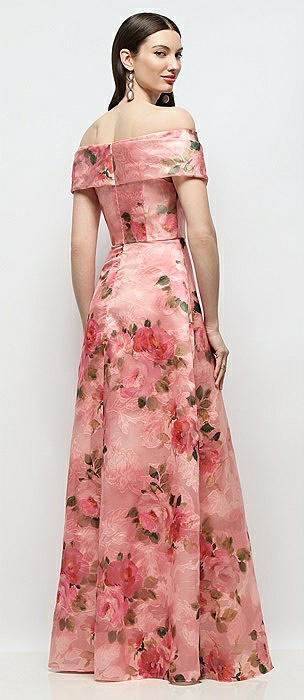 Off-Shoulder Wrap Organza Jacquard Floral Maxi Dress with Full Skirt in guava floral print