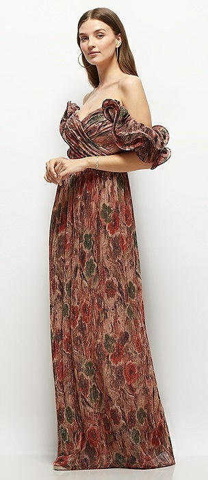 Dramatic Ruffle Edge Strap Fall Foral Pleated Metallic Maxi Dress