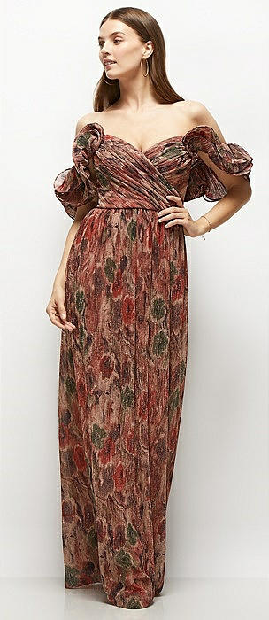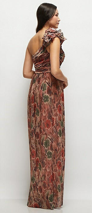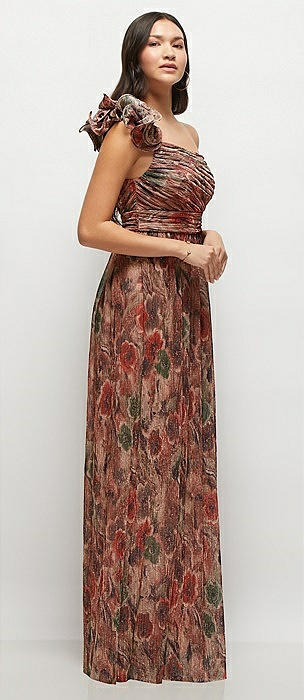 Dramatic Ruffle Edge One-Shoulder Fall Foral Pleated Metallic Maxi Dress