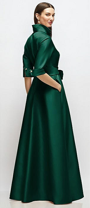 3/4 Sleeve Satin Shirt Dress Gown with Sash and Jeweled Buttons in hunter green