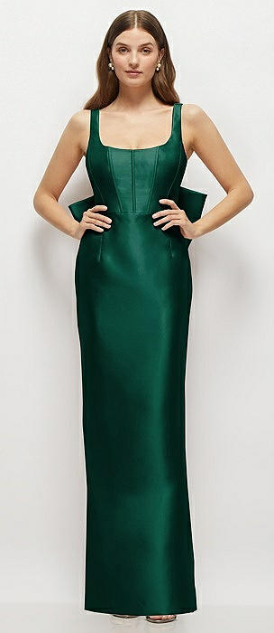 Scoop Neck Corset Satin Maxi Dress with Floor-Length Bow Tails in hunter green
