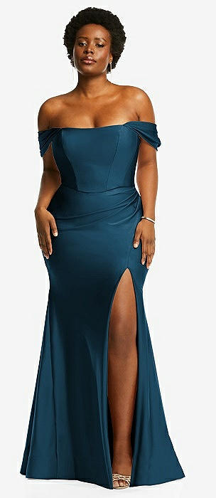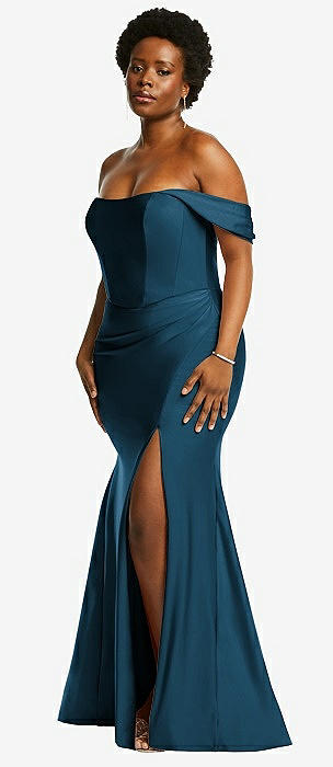 Off-the-Shoulder Corset Stretch Satin Mermaid Dress with Slight Train in atlantic blue
