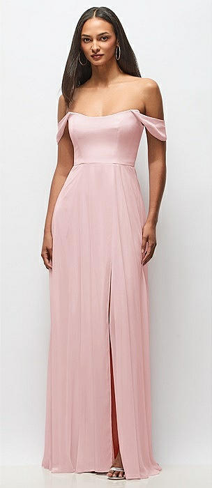 Shaped Strap Portrait Neckline Fluid Satin Maxi Dress with Full Skirt in ballet pink