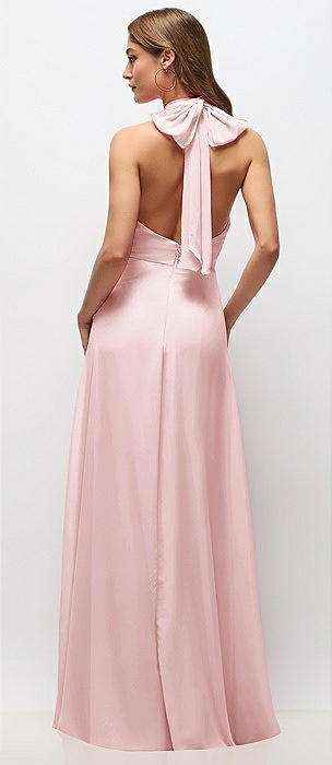 Band Collar Halter Open Back Fluid Satin Maxi Dress with Self-Tie Bow in ballet pink