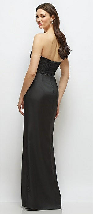 Strapless Lace and Satin Corset Maxi Dress with Draped Column Skirt in black