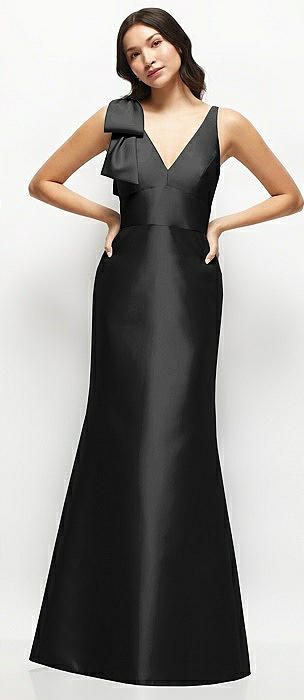 Deep V-back Satin Trumpet Dress with Cascading Bow at One Shoulder in black