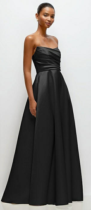 Strapless Draped Cat-Eye Satin Maxi Dress with Full Skirt in black