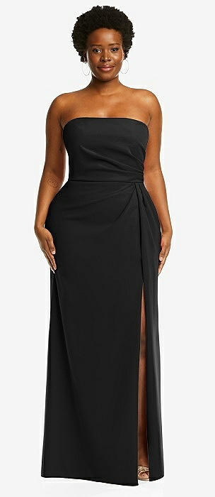 Strapless Pleated Faux Wrap Trumpet Gown with Front Slit in black