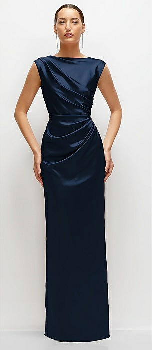 Shirred Shoulder Stretch Satin Mermaid Dress with Slight Train in midnight navy