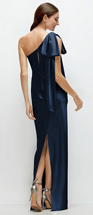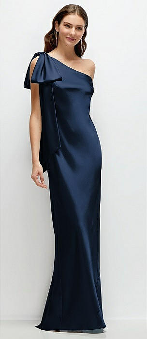 One-Shoulder Bias-Cut Satin Maxi Dress with Cascading Shoulder Bow in midnight navy
