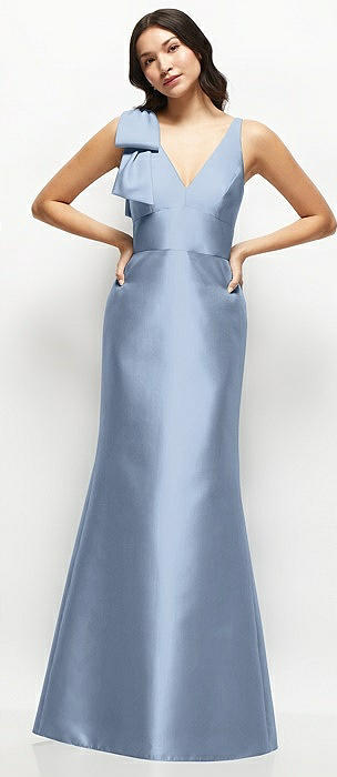 Deep V-back Satin Trumpet Dress with Cascading Bow at One Shoulder in cloudy