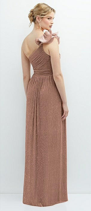 Dramatic Ruffle Edge One-Shoulder Metallic Pleated Maxi Dress in metallic sienna
