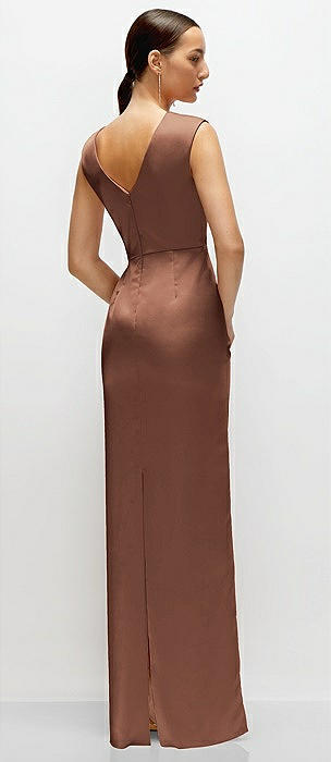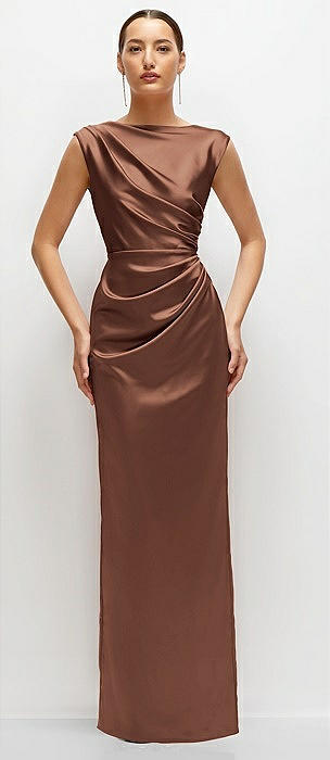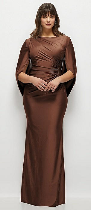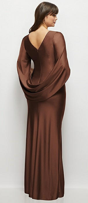 Draped Stretch Satin Maxi Dress with Built-in Capelet in cognac