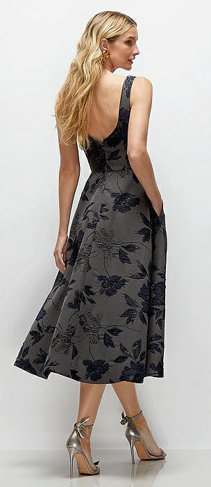Noir Midnight Navy Square Neck Floral Metallic Jacquard Midi Dress in noir midnight navy