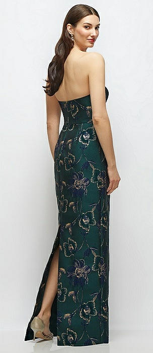 Strapless Oscar Metallic Floral Jacquard Column Dress with Back Slit in evergreen floral