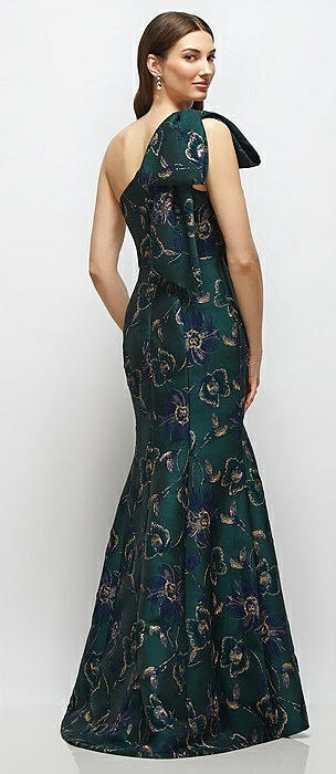 Bow One-Shoulder Oscar Metallic Floral Jacquard Trumpet Maxi Dress in evergreen floral