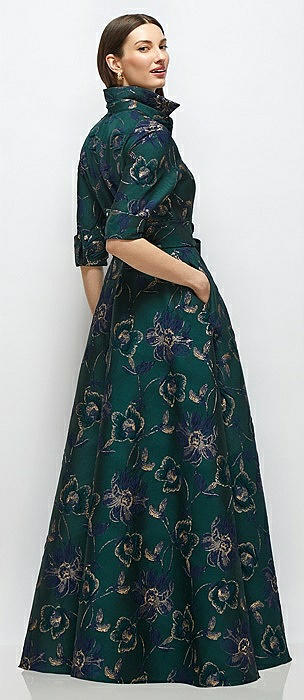 Oscar Metallic Floral Jacquard Shirt Dress Gown with Sash and Jeweled Buttons in evergreen floral