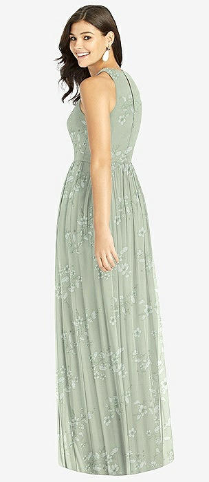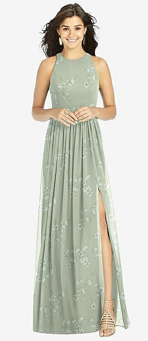 Shirred Skirt Jewel Neck Halter Dress with Front Slit in vintage primrose sage