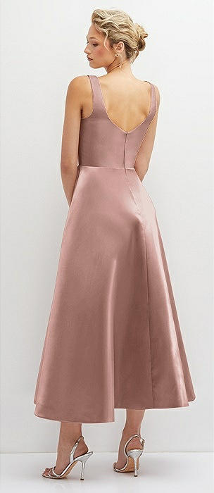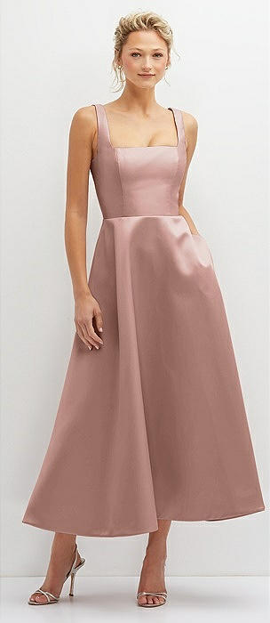Square Neck Satin Midi Dress with Full Skirt & Pockets in neu nude