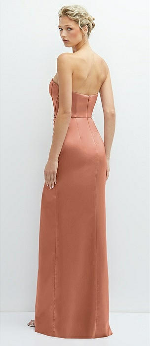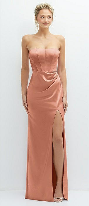 Strapless Topstitched Corset Satin Maxi Dress with Draped Column Skirt in copper penny