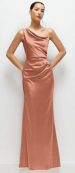 One-Shoulder Cat-Eye Neckline Fit and Flare Satin Maxi Dress in copper penny