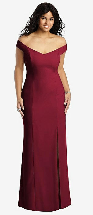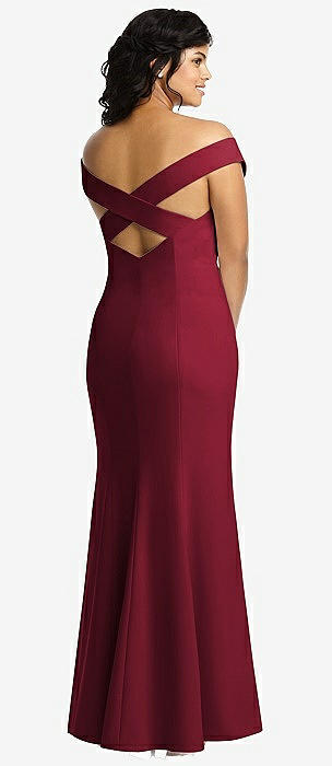 Off-the-Shoulder Criss Cross Back Trumpet Gown in burgundy
