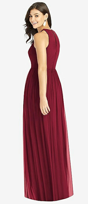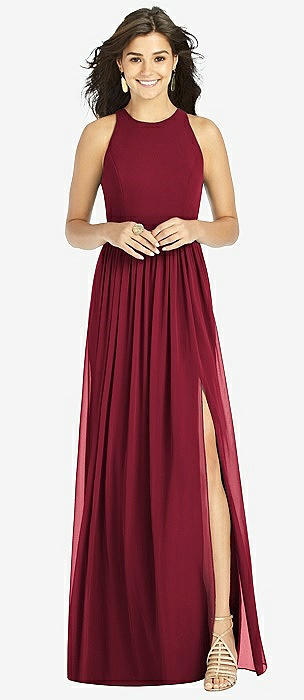 Shirred Skirt Jewel Neck Halter Dress with Front Slit in burgundy