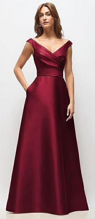 Off-the-Shoulder Draped Wrap Satin Maxi Dress in burgundy