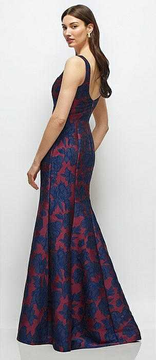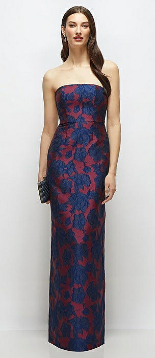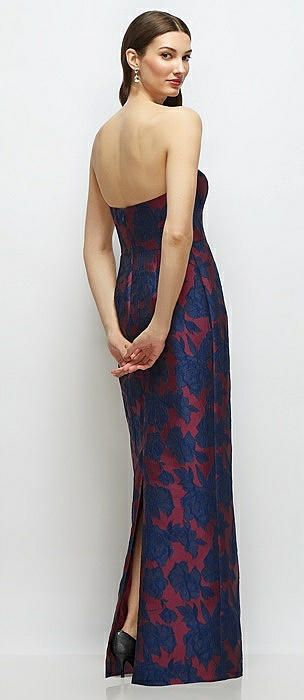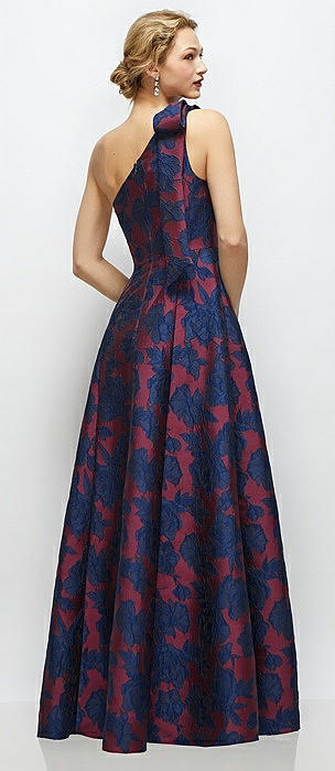 Bow One-Shoulder Full A-Line Heritage Floral Jacquard Maxi Dress in burgundy midnight floral