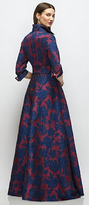 Heritage Floral Jacquard Shirt Dress Gown with Sash and Jeweled Buttons in burgundy midnight floral