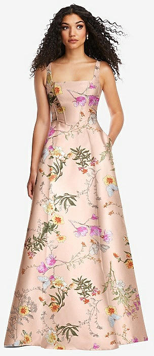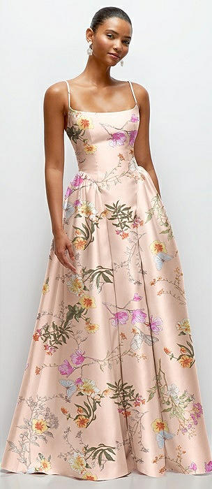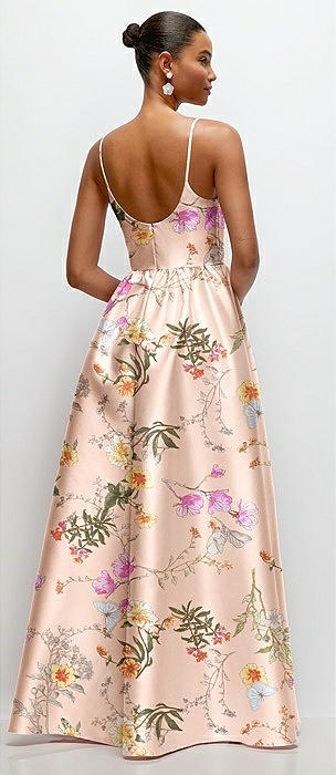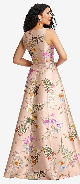 Scoop Neck Drop Basque Skirt Floral Satin Maxi Dress with Pockets in butterfly botanica pink sand