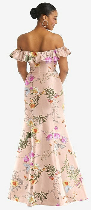 Off-the-Shoulder Ruffle Neck Floral Satin Trumpet Gown in butterfly botanica pink sand