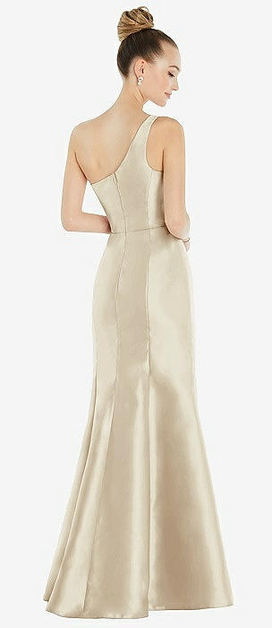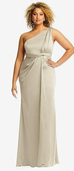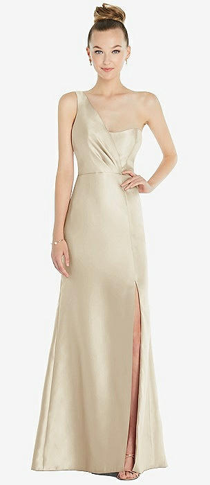 Draped One-Shoulder Satin Trumpet Gown with Front Slit in champagne