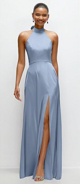 Band Collar Halter Open Back Fluid Satin Maxi Dress with Self-Tie Bow in cloudy