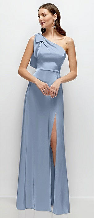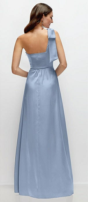 Bow One-Shoulder Fluid Satin Maxi Dress with Full Skirt in cloudy