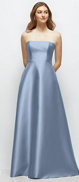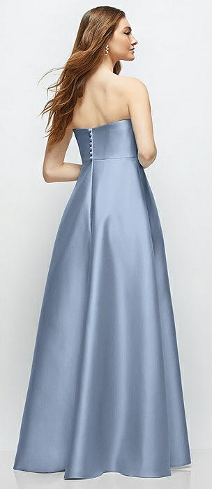 Strapless Satin Gown with Full Skirt and Covered Buttons at Back in cloudy