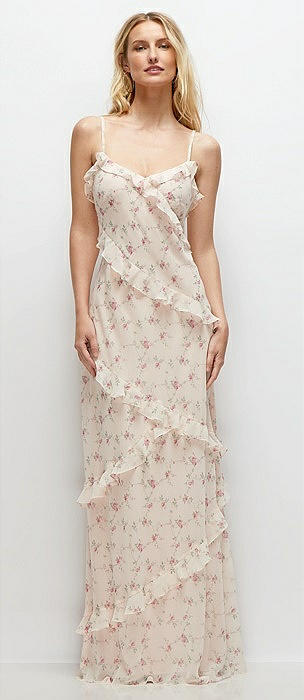 Asymmetrical Ruffle Chiffon Bias Slip Maxi Dress in coquette floral print