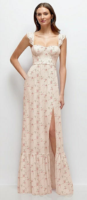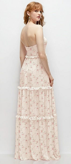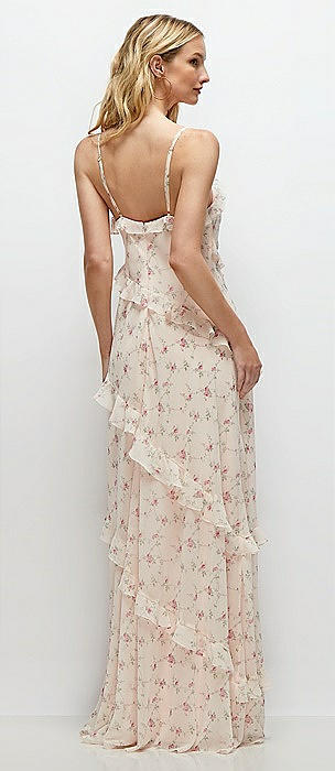 Bustier-Style Chiffon Tiered Ruffle Maxi Dress with Adjustable Straps in coquette floral print