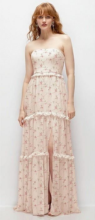 Strapless Chiffon Maxi Dress with Tiered Micro Ruffle Full Skirt in coquette floral print