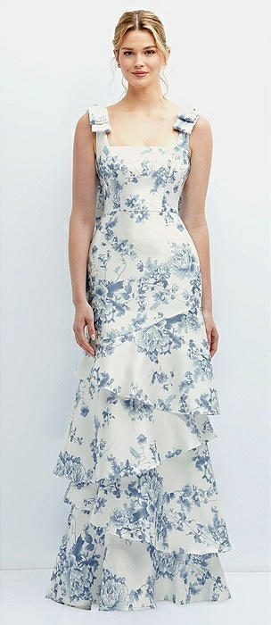 Floral Bow-Shoulder Satin Maxi Dress with Asymmetrical Tiered Skirt in cottage rose larkspur