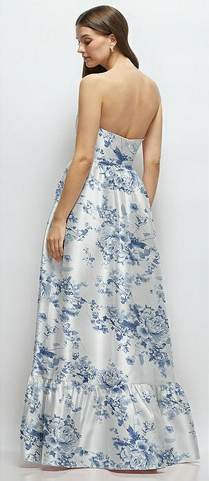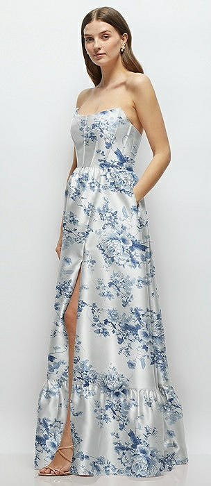 Floral Lace-Up Back Bustier Satin Dress with Full Skirt and Pockets in cottage rose larkspur