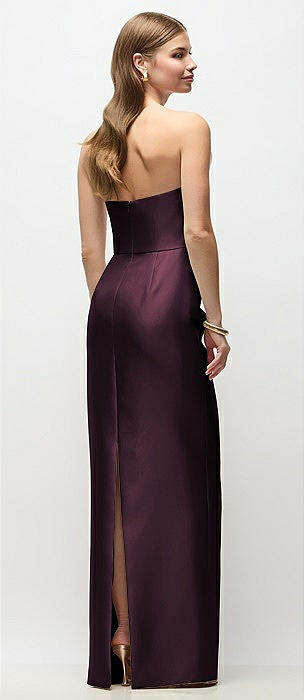 Strapless Asymmetrical Draped Satin Column Maxi Dress in deep plum