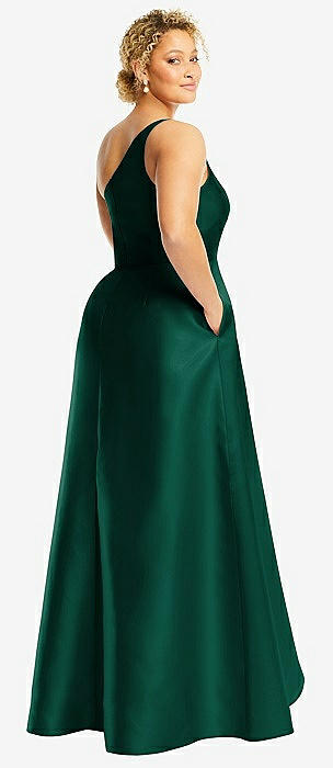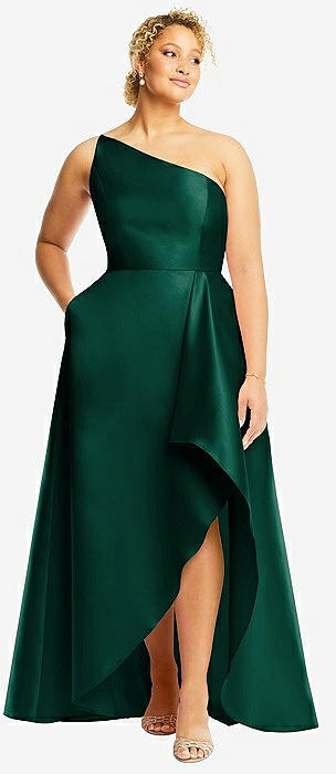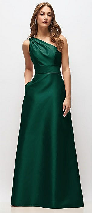 One-Shoulder Satin Gown with Draped Front Slit and Pockets in hunter green
